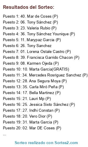 Lista de participantes: 01. Lorena Ostale Castro (P), 02. Mar DE Coses (P), 03. Tony Sanchez, 04. Jessica Sixto Sánchez (GRATIS), 05. Sandra García (PAGADO), 06. Tony Sánchez (P), 07. Marta Garcia (P), 08. Karmen Ojeda (P), 09. Carmen Ponte (P), 10. Marta Garcia(GRATIS), 11. Marypaz Garcia (P), 12. Karmen Ojeda (P), 13. Carmen Ponte (GRATIS), 14. Carla Miró Peña (P), 15. Mercedes Rodriguez Sanchez (P), 16. Karmen Ojeda (P), 17. Bella Martinez (P), 18. Marypaz Garcia (P), 19. Triana Valencia (P), 20. Vero Dior (P), 21. Lauri Mp (P), 22. Marta Garcia (P), 23. Valeria Rubio (P), 24. Angeles Maso (P), 25. Jessica Sixto Sánchez (P), 26. Tony Sanchez, 27. Indhi Constan (P), 28. Ana Segura Moya (P), 29. Karmen Ojeda (P), 30. Tony Sanchez, 31. Marta Garcia (P), 32. Bella Martinez (GRATIS), 33. Laura Cabada Espinosa (P), 34. Mercedes Rosriguez Sanchez (P), 35. Carla Miró Peña (P), 36. Tony Sánchez Younique (P), 37. Karmen Ojeda (GRATIS), 38. Karmen Ojeda (P), 39. Francisca Garrido Chacon (P), 40. Mar de Coses (P).