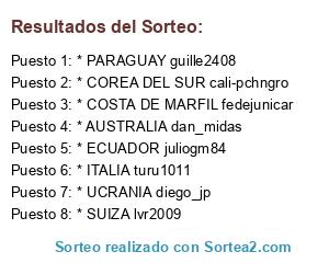 Lista de participantes: SEGUNDO GRUPO A: CAMERÚN trezeguet32, BOSNIA-HERZEGOVINA klmatiu: COREA DEL SUR cali-pchngro, ISRAEL tomasmorning: URUGUAY hernan1973, SENEGAL mekno_mekno: ESPAÑA nahu_astaroth, IRLANDA DEL NORTE gustachenge11: CROACIA Pilus23, ITALIA turu1011: POLONIA palazzopasion, AUSTRIA sEbAs_1983 : FRANCIA daniel_cabj32, SEGUNDO GRUPO H: COLOMBIA darckok.