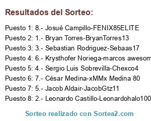 Lista de participantes: 1.- Bryan Torres-BryanTorres13, 2.- Leonardo Castillo-Leonardohalo100, 3.- Sebastian Rodriguez-Sebaas17, 4.- Sergio Luis Sobrevilla-Chexco4, 5.- Jacob Aldair-JacobGtz11, 6.- Krysthofer Noriega-marcos awesome, 7.- César Medina-xMMx Medina 80, 8.- Josué Campillo-FENIX85ELITE.
