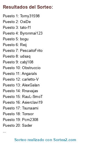 Lista de participantes: 23impresion, 94josemi, adriian10, AdriRealG4Life, Afm-20, Agripa2012, Ale1993, Aletoman1, Alex11fabela, Alex2377, AlexGalan, AlexGprofut, Alexxxxxxx, AmR015, Andy15rm, Angarals, ANozal, Antoniorecio47, Aperez1201, AsesinoooCereal, Asierclavi19, Asierhernanz10, atheticborja, ati13radeon, Augussteam14, Awenao, BartSimpson99, beat1989, Beatman, belar98, beto5-5, BilisMadridista, bogu, BvBReus, Byronmai123, cabj108, carletto-V, Carmelo-Antonhy, cesman, CFSC, chacnorris, chewaka1985, chinoavl, colchonero78, Coroco14, Kikli, Kisawea123, KOG-1402, KUROI2000, Kush97DI, Laude, Lauramome, Lauro-karlos, LCARP10, Leco-10, Lhozedu, LiveBlood7, Luisete10, luisillo94, LY10, madrid-cr7, Magic-Spike, Majuka, Manchester1421, Manuelperu, Mark-axel-shawn, Marko19, mayukaif, Mecly, Menudopufo, miguel13gz22, Mik00, Montunacho97, Morado2293, Mostovoi-10, mugre, Negrogarca, Nicognr, Nidar99, Obstruccio, OswaldOrtiz, Ovejanegra23, OxiDe, ozchess, P0PY, p3droml, Pablitot95, Pagolmos, Palol, PalomoJack, Patehiyoo, Pau42, Pcm2308, Pelotazo-nono, PescaitoFrito, Pocho1997, ProgcitoW, RafaDarKo77, Raheja, RaizoK-, Rapper4life, Rauljuniordegea, raulponte3, RauL-SmoT, Reij, Rnavajas, Robertino94, ROMAN-GRANATE, Rtuik, Sader, Saias, Sambas, Sarnifero, Senyorcarne, Simonurb, sirbsr10, skuad, sniper8, Sr-waskaman, Sucodani, super-esteban, Tangarin92, Tato94, tato-f1, Tit2009, Tnk10, Tomy31598, Tonsor, Torino14, TrustPhox, Tsunaami, TXUS79, udsaq, URIEL-CABJ, V1c7or, Vano07, VdeVaTo, VictorAG, Vilker87, Viti786, Wato29, x0abel0x, xLiiGhTz-17, Yancoverer, Yandel93, yeahnigga, ZakkariaBakali, Van-Persie8.