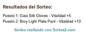 Lista de participantes: Warrior Leather Helm - Vitalidad +5, Warrior Leather Armor - Vitalidad +5, Warrior Leather Gloves - Vitalidad +5, Warrior Leather Pants - Vitalidad +5, Warrior Leather Boots - Vitalidad +5, Warrior Kriss - Fuerza +5, Hyperion Bronze Helm - Vitalidad +5, Hyperion Bronze Armor - Vitalidad +5, Hyperion Bronze Gloves - Vitalidad +5, Hyperion Bronze Pants - Vitalidad +5, Hyperion Bronze Boots - Vitalidad +5, Hyperion Double Blade - Fuerza +5, Eplete Scale Helm - Vitalidad +5, Eplete Scale Armor - Vitalidad +5, Eplete Scale Gloves - Vitalidad +5, Eplete Scale Pants - Vitalidad +5, Eplete Scale Boots - Vitalidad +5, Eplete Falchion - Fuerza +5, Garuda Brass Helm - Vitalidad +5, Garuda Brass Armor - Vitalidad +5, Garuda Brass Gloves - Vitalidad +5, Garuda Brass Pants - Vitalidad +5, Garuda Brass Boots - Vitalidad +5, Garuda Crescent Axe - Fuerza +5, Kantata Plate Helm - Vitalidad +5, Kantata Plate Armor - Vitalidad +5, Kantata Plate Gloves - Vitalidad +5, Kantata Plate Pants - Vitalidad +5, Kantata Plate Boots - Vitalidad +5, Kantata Crystal Sword - Fuerza +5, Hyon Dragon Helm - Vitalidad +5, Hyon Dragon Armor - Vitalidad +5, Hyon Dragon Gloves - Vitalidad +5, Hyon Dragon Pants - Vitalidad +5, Hyon Dragon Boots - Vitalidad +5, Hyon Chaos Dragon Axe, Mahes Black Dragon Helm - Vitalidad +5, Mahes Black Dragon Armor - Vitalidad +5, Mahes Black Dragon Gloves - Vitalidad +5, Mahes Black Dragon Pants - Vitalidad +5, Mahes Black Dragon Boots - Vitalidad +5, Mahes Black Knight Blade - Fuerza +5, Bragi Dark Phoenix Helm - Vitalidad +5, Bragi Dark Phoenix Armor - Vitalidad +5, Bragi Dark Phoenix Gloves - Vitalidad +5, Bragi Dark Phoenix Pants - Vitalidad +5, Bragi Dark Phoenix Boots - Vitalidad +5, Bragi Spirit Sword - Fuerza +5, Apollo Pad Helm - Vitalidad +5, Apollo Pad Armor - Vitalidad +5, Apollo Pad Gloves - Vitalidad +5, Apollo Pad Pants - Vitalidad +5, Apollo Pad Boots - Vitalidad +5, Apollo Skull Staff - Fuerza +5, Evis Bone Helm - Vitalidad +5, Evis Bone Armor - Vitalidad +5, Evis Bone Gloves - Vitalidad +5, Evis Bone Pants - Vitalidad +5, Evis Bone Boots - Vitalidad +5, Evis Resurrection Staff - Fuerza +5, Heras Sphinx Helm - Vitalidad +5, Heras Sphinx Armor - Vitalidad +5, Heras Sphinx Gloves - Vitalidad +5, Heras Sphinx Pants - Vitalidad +5, Heras Sphinx Boots - Vitalidad +5, Heras Gorgon Staff - Fuerza +5, Anubis Legendary Helm - Vitalidad +5, Anubis Legendary Armor - Vitalidad +5, Anubis Legendary Gloves - Vitalidad +5, Anubis Legendary Pants - Vitalidad +5, Anubis Legendary Boots - Vitalidad +5, Anubis Legendary Staff - Fuerza +5, Alvis Grand Soul Helm - Vitalidad +5, Alvis Grand Soul Armor - Vitalidad +5, Alvis Grand Soul Gloves - Vitalidad +5, Alvis Grand Soul Pants - Vitalidad +5, Alvis Grand Soul Boots - Vitalidad +5, Alvis Grand Soul Staff - Fuerza +5, Ceto Vine Helm - Vitalidad +5, Ceto Vine Armor - Vitalidad +5, Ceto Vine Gloves - Vitalidad +5, Ceto Vine Pants - Vitalidad +5, Ceto Vine Boots - Vitalidad +5, Ceto Rapier - Fuerza +5, Gaia Silk Helm - Vitalidad +5, Gaia Silk Armor - Vitalidad +5, Gaia Silk Gloves - Vitalidad +5, Gaia Silk Pants - Vitalidad +5, Gaia Silk Boots - Vitalidad +5, Gaia Bluewing Crossbow - Fuerza +5, Odin Wind Helm - Vitalidad +5, Odin Wind Armor - Vitalidad +5, Odin Wind Gloves - Vitalidad +5, Odin Wind Pants - Vitalidad +5, Odin Wind Boots - Vitalidad +5, Odin Wind Light Saber - Fuerza +5, Argo Spirit Helm - Vitalidad +5, Argo Spirit Armor - Vitalidad +5, Argo Spirit Gloves - Vitalidad +5, Argo Spirit Pants - Vitalidad +5, Argo Spirit Boots - Vitalidad +5, Argo Spirit Chaos Nature Bow, Gywen Guardian Helm - Vitalidad +5, Gywen Guardian Armor - Vitalidad +5, Gywen Guardian Gloves - Vitalidad +5, Gywen Guardian Pants - Vitalidad +5, Gywen Guardian Boots - Vitalidad +5, Gywen Silver Bow - Fuerza +5, Frigg Divine Helm - Vitalidad +5, Frigg Divine Armor - Vitalidad +5, Frigg Divine Gloves - Vitalidad +5, Frigg Divine Pants - Vitalidad +5, Frigg Divine Boots - Vitalidad +5, Frigg Celestial Bow - Fuerza +5, Gaion Unicorn Armor - Vitalidad +5, Gaion Unicorn Gloves - Vitalidad +5, Gaion Unicorn Pants - Vitalidad +5, Gaion Unicorn Boots - Vitalidad +5, Gaion Rune Blade - Fuerza +5, Tyr Thunder Hawk Armor - Vitalidad +5, Tyr Thunder Hawk Gloves - Vitalidad +5, Tyr Thunder Hawk Pants - Vitalidad +5, Tyr Thunder Hawk Boots - Vitalidad +5, Tyr Thunder Blade - Fuerza +5, Broy Light Plate Mask - Vitalidad +5, Broy Light Plate Armor - Vitalidad +5, Broy Light Plate Gloves - Vitalidad +5, Broy Light Plate Pant - Vitalidad +5, Broy Light Plate Boots - Vitalidad +5, Broy Dragon Spear - Fuerza +5, Agnis Adamantine Mask - Vitalidad +5, Agnis Adamantine Armor - Vitalidad +5, Agnis Adamantine Gloves - Vitalidad +5, Agnis Adamantine Pant - Vitalidad +5, Agnis Adamantine Boots - Vitalidad +5, Agnis Lord Scepter - Fuerza +5, Khons Dark Steel Mask - Vitalidad +5, Khons Dark Steel Armor - Vitalidad +5, Khons Dark Steel Gloves - Vitalidad +5, Khons Dark Steel Pant - Vitalidad +5, Khons Dark Steel Boots - Vitalidad +5, Khons Dark Steel Scepter - Fuerza +5, Warrior Leather Helm - Vitalidad +10, Warrior Leather Armor - Vitalidad +10, Warrior Leather Gloves - Vitalidad +10, Warrior Leather Pants - Vitalidad +10, Warrior Leather Boots - Vitalidad +10, Warrior Kriss - Fuerza +10, Hyperion Bronze Helm - Vitalidad +10, Hyperion Bronze Armor - Vitalidad +10, Hyperion Bronze Gloves - Vitalidad +10, Hyperion Bronze Pants - Vitalidad +10, Hyperion Bronze Boots - Vitalidad +10, Hyperion Double Blade - Fuerza +10, Eplete Scale Helm - Vitalidad +10, Eplete Scale Armor - Vitalidad +10, Eplete Scale Gloves - Vitalidad +10, Eplete Scale Pants - Vitalidad +10, Eplete Scale Boots - Vitalidad +10, Eplete Falchion - Fuerza +10, Garuda Brass Helm - Vitalidad +10, Garuda Brass Armor - Vitalidad +10, Garuda Brass Gloves - Vitalidad +10, Garuda Brass Pants - Vitalidad +10, Garuda Brass Boots - Vitalidad +10, Garuda Crescent Axe - Fuerza +10, Kantata Plate Helm - Vitalidad +10, Kantata Plat