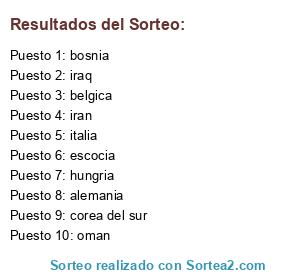 Lista de participantes: iraq, iran, corea del sur, oman, escocia, bosnia, belgica, hungria, alemania, italia.
