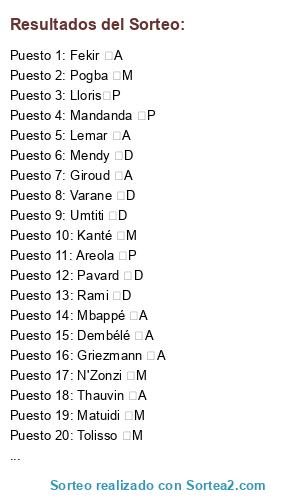 Lista de participantes: Areola P, Dembélé A, Fekir A, Giroud A, Griezmann A, Kanté M, Kimpembe D, Lemar A, Lloris P, Lucas H D, Mandanda P, Matuidi M, Mbappé A, Mendy D, N'Zonzi M, Pavard D, Pogba M, Rami D, Sidibé D, Thauvin A, Tolisso M, Umtiti D, Varane D.