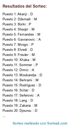 Lista de participantes: Akanji D, Behrami M, Bürki P, Djourou D, Drmic A, Džemaili M, Elvedi D, Embolo A, Fernandes M, Freuler M, Gavranovic A, Lang D, Lichtsteiner D, Moubandje D, Mvogo P, Rodríguez D, Schär D, Seferovic A, Shaqiri M, Sommer P, Xhaka M, Zakaria M, Zuber M.