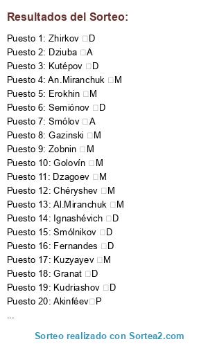 Lista de participantes: Akinféev P, Al.Miranchuk M, An.Miranchuk M, Chéryshev M, Dzagoev M, Dziuba A, Erokhin M, Fernandes D, Gabúlov P, Gazinski M, Golovín M, Granat D, Ignashévich D, Kudriashov D, Kutépov D, Kuzyayev M, Lunev P, Samédov M, Semiónov D, Smólnikov D, Smólov A, Zhirkov D, Zobnin M.