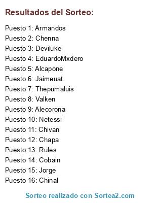 Lista de participantes: Chenna, Chinal, Deviluke, Chapa, Cobain, Thepumaluis, Chivan, Alcapone, EduardoMxdero, Alecorona, Jorge, Rules, Armandos, Valken, Jaimeuat, Netessi.