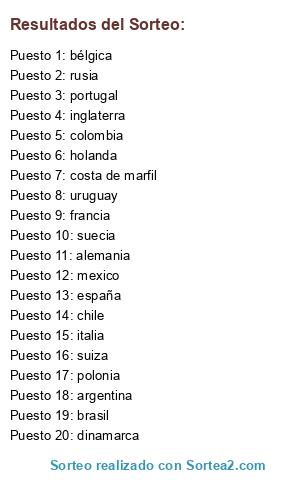 Lista de participantes: chile, mexico, dinamarca, polonia, costa de marfil, suiza, suecia, colombia, rusia, uruguay, holanda, bélgica, inglaterra, portugal, francia, brasil, argentina, italia, alemania, españa.