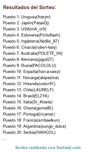 Lista de participantes: Uruguay(franjm), Australia(POLETE_94), USA(mA_cr9), Rusia(PACOLOLU), Grecia(fran693), España(fran-avarez), Holanda(vixtor91), Argentina(xungo_dulce), Brasil(EL2YA), Noruega(alopezma), Chile(LAURELF), Japón(PatasDj), Italia(Sr_Kloste), Croacia(ruben-kaly), Serbia(IVANCOL), Portugal(ricamar), Francia(arribaelkun), Eslovenia(Pichuflash), Inglaterra(Netillo_87), Alemania(jagol27), Ghana(gome85).