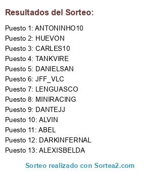 Lista de participantes: LENGUASCO, DANTEJJ, JFF_VLC, MINIRACING, HUEVON, DANIELSAN, ABEL, ANTONINHO10, DARKINFERNAL, ALVIN, TANKVIRE, ALEXISBELDA, CARLES10.