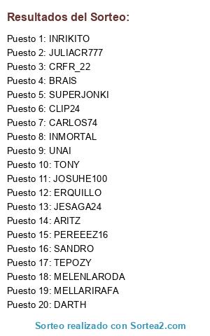 Lista de participantes: MELENLARODA, TEPOZY, MELLARIRAFA, INRIKITO, ARITZ, BRAIS, CRFR_22, ERQUILLO, CLIP24, JESAGA24, PEREEEZ16, INMORTAL, JOSUHE100, CARLOS74, SANDRO, TONY, DARTH, UNAI, SUPERJONKI, JULIACR777.