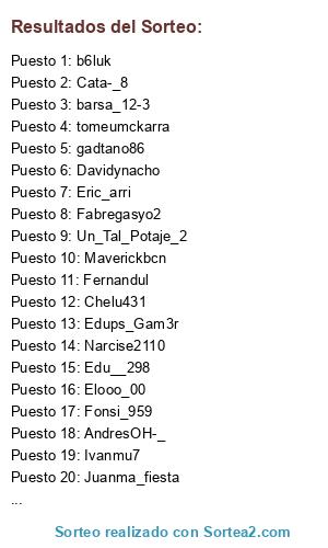 Lista de participantes: AndresOH-_ , Cata-_8, Juanito_reina84, Jairoesteo, tomeumckarra, Fonsi_959, Juanma_fiesta, Bukerke89, barsa_12-3, Eric_arri, Maverickbcn, gadtano86, Chelu431, Rafaelinho_10, Edups_Gam3r, Un_Tal_Potaje_2, Ortega178, Edu__298, Ganso15, Fernandul, Ayp69, Narcise2110, Edu_ka10, Elooo_00, Ivanmu7, xavicauxo10, b6luk, Davidynacho, Martinares, Niko_salazar11, Lolkoracing7, Fabregasyo2, .