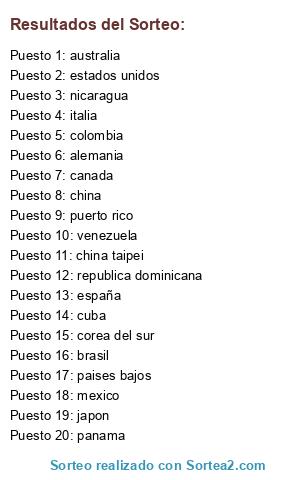 Lista de participantes: brasil, china, cuba, japon, australia, china taipei, corea del sur, paises bajos, españa, puerto rico, republica dominicana, venezuela, canada, estados unidos, italia, mexico, colombia, panama, nicaragua, alemania.