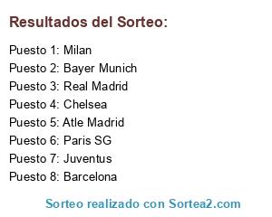 Lista de participantes: Barcelona, Real Madrid, Atle Madrid, Bayer Munich, Chelsea, Juventus, Milan, Paris SG, .