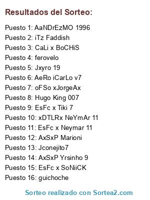 Lista de participantes: AxSxP Marioni, AeRo iCarLo v7, AxSxP Yrsinho 9, iTz Faddish, EsFc x SoNiiCK, oFSo xJorgeAx, EsFc x Neymar 11, EsFc x Tiki 7, Jconejito7, Hugo King 007, Jxyro 19, guichoche, ferovelo, AaNDrEzMO 1996, xDTLRx NeYmAr 11, CaLi x BoCHiS.