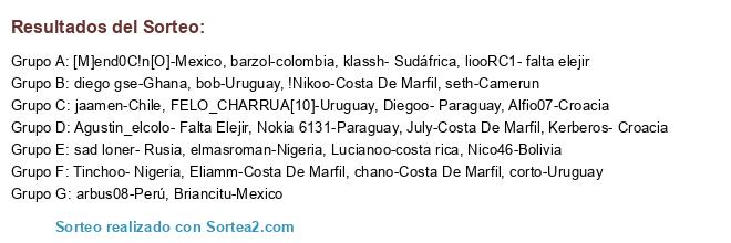 Lista de participantes: July-Costa De Marfil, jaamen-Chile, corto-Uruguay, Nico46-Bolivia, barzol-colombia, Nokia 6131-Paraguay, seth-Camerun, bob-Uruguay, chano-Costa De Marfil, Eliamm-Costa De Marfil, liooRC1- falta elejir, Diegoo- Paraguay, Tinchoo- Nigeria, Lucianoo-costa rica, [M]end0C!n[O]-Mexico, diego gse-Ghana, sad loner- Rusia, Briancitu-Mexico, elmasroman-Nigeria, Agustin_elcolo- Falta Elejir, !Nikoo-Costa De Marfil, arbus08-Perú, Alfio07-Croacia, klassh- Sudáfrica, FELO_CHARRUA[10]-Uruguay, Kerberos- Croacia.