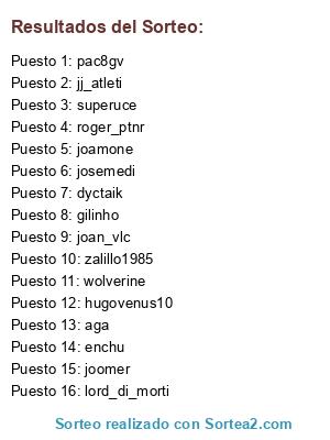 Lista de participantes: joamone, hugovenus10, jj_atleti, dyctaik, zalillo1985, enchu, joan_vlc, superuce, gilinho, pac8gv, aga, lord_di_morti, joomer, roger_ptnr, wolverine, josemedi.