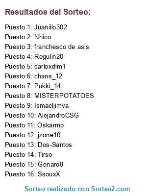 Lista de participantes: AlejandroCSG, Nhico, SsouxX, chans_12, Pukki_14, Regulin20, jzone10, Juanillo302, Ismaeljimva, Oskarmp, Genaro8, carloxdim1, franchesco de asis, Dos-Santos, Tirso, MISTERPOTATOES.
