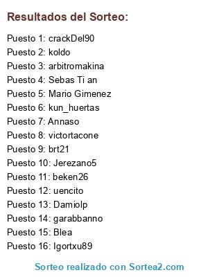 Lista de participantes: uencito, beken26, koldo, Jerezano5, arbitromakina, brt21, crackDel90, Sebas Ti an, kun_huertas, Igortxu89, victortacone, garabbanno, Damiolp, Mario Gimenez, Annaso, Blea.