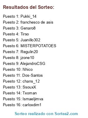 Lista de participantes: AlejandroCSG, Nhico, SsouxX, chans_12, Pukki_14, Regulin20, jzone10, Juanillo302, Ismaeljimva, Txoman, Genaro8, carloxdim1, franchesco de asis, Dos-Santos, Tirso, MISTERPOTATOES.