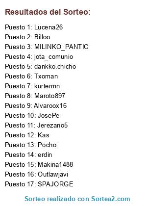 Lista de participantes: Kas, MILINKO_PANTIC, Lucena26, dankko.chicho, erdin, Pocho, kurtermn, SPAJORGE, jota_comunio, Alvaroox16, Outlawjavi, JosePe, Makina1488, Billoo, Txoman, Maroto897, Jerezano5.