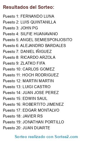 Lista de participantes: JONATHAN PORTILLO, ZLATKO FIFA, FERNANDO LUNA, LUIGI CASTRO, LUIS QUINTANILLA, SILFIE HUANAVANO, RICARDO ARZOLA, HOCH RODRIGUEZ, JAVIER RS, EDGAR MONTALVO, ALEJANDRO BARDALES, JUAN DUARTE, MARTIN MARTIN, ROBERTITO JIMENEZ, DANIEL IÑIGUEZ, JUAN JOSE PEREZ, EDWIN SAUL, JOHN PG, CARLOS GOMEZ, ANGEL SEMIESPONJOSITO.