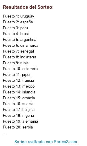 Lista de participantes: alemania, argentina, brasil, belgica, españa, francia, portugal, colombia, croacia, inglaterra, mexico, polonia, rusia, uruguay, dinamarca, egipto, islandia, japon, marruecos, nigeria, peru, senegal, serbia, suecia.