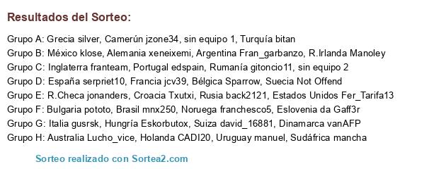Lista de participantes: España serpriet10, Holanda CADI20, Alemania xeneixemi, Inglaterra franteam, Brasil mnx250, Italia gusrsk, Portugal edspain, Croacia Txutxi, México klose, Argentina Fran_garbanzo, Noruega franchesco5, Grecia silver, Francia jcv39, Rusia back2121, Uruguay manuel, Suecia Not Offend, Dinamarca vanAFP, Eslovenia da Gaff3r, Australia Lucho_vice, Turquía bitan, Estados Unidos Fer_Tarifa13, Suiza david_16881, R.Irlanda Manoley, Bélgica Sparrow, R.Checa jonanders, Hungría Eskorbutox, Bulgaria pototo, Sudáfrica mancha, Camerún jzone34, Rumanía gitoncio11, sin equipo 1, sin equipo 2.