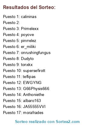 Lista de participantes: EWGYNG, G66Physis666, teflipas, Anthoniethe, calininas, albaro163, onrushingfungus, tonxkx, supersefirott, pinrrelez, Primelexx, morafrades, Dudyto, er_miliki, JA55555VVI, poyove, .