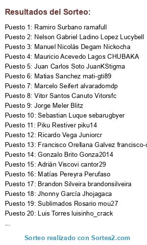 Lista de participantes: Juan Carlos Soto JuanKStigma, Luis Torres luisinho_crack, Javier Barqui javibarqui, Sebastian Luque sebarugbyer, Luciano Cares Oyarzo jack_torrance, Sublimados Rosario mou27, Faraon Calamar FARAON_CALAMAR, Javier Guastini Guasti, Ricardo Vega Juniorcr, Vitor Santos Canuto Vitorsfc, Marcelo Seifert alvaradomdp, Gonzalo Brito Gonza2014, Seba Lombardi sebamanya, Jhonny García Jhojagaca, Francisco Orellana Galvez francisco-cabj, Rene Combina Renecom, Piku Restiver piku14, El Chila Vazquez Vega Elchila2014, Adrián Viscovi cantor29, Brandon Silveira brandonsilveira, Thiago Jansem tjansem, Fernando Nadal elmonodaniel, Nelson Gabriel Ladino Lopez Lucybell, Rodolfo Roggero Fitofarais, Manuel Nicolás Degam Nickocha, Matías Pereyra Perufaso, Mauricio Acevedo Lagos CHUBAKA, Ramiro Surbano ramafull, Matias Sanchez mati-gti89, Jorge Meler Blitz, Arku Pes arku, Da Ri Fegrva davigol.