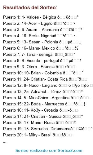 Lista de participantes: 1- Miky - Brasil 🇧🇷, 2- Tibu - España 🇪🇸🇮🇨, 3- Otero - Francia 🇫🇷, 4- Valdes - Bélgica 🇧🇪, 5- MirloChico - Argentina 🇦🇷, 6- Airam - Alemania 🇩🇪, 7- Tana - senegal 🇸🇳, 8- Naco - England 🏴, 9- Vicente - portugal 🇵🇹, 10- Brian - Colombia 🇨🇴, 11- Ko3y - Croacia 🇭🇷, 12- Tirita - Uruguay 🇺🇾, 13- Sesan - Polonia 🇵🇱, 14- Acer - Egipto 🇪🇬, 15- Serrucho- Dinamarca🇩🇰, 16- Manu- Mexico 🇲🇽, 17- Mario- Rusia 🇷🇺, 18- Serlu- Nigeria🇳🇬, 19- pepe - Suiza 🇨🇭, 20- Angel - Serbia 🇷🇸, 21- Cristian - Suecia 🇸🇪, 22- Borja - Marruecos 🇲🇦, 23- Edder- Japón 🇯🇵, 24- Cristian- Costa Rica 🇨🇷, 25- Adrianct - Túnez 🇹🇳, 26- Bertitus - Perú.