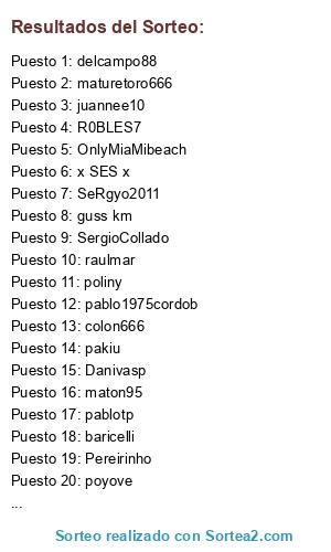 Lista de participantes: baricelli, Pedrofox, juannee10, colon666, brayanivan1990, Danivasp, Principito85, poyove, Jayoldi, MIKEY10 ElmalO, poliny, Pereirinho, king of goblins, lobitooooo, x SES x, Pepitogrillo96, maton95, raulmar, DAVILON69, rastamanlasarte, alexnov89, PULIFUMI, Murill069, SeRgyo2011, pablo1975cordob, delcampo88, TurfyTomas, puerto santiago, guss km, R0BLES7, slassi14, kikofer, SergioCollado, XxAfro8xX, exposito11, pakiu, manolozon, OnlyMiaMibeach, Ehos4, pablotp, maturetoro666.