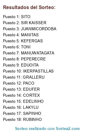 Lista de participantes: MANITAS, SAPINHO, SITO, MANUWATAGATA, IKERPASTILLAS, JUANMICORDOBA, KEFERGAS, PEPERECRE, EDUOITA, PACO, LAKYLU, EDUFER, GRALLERU, RUBINHO, CORTEX, EDELINHO, TONI, SIR KAISSER.
