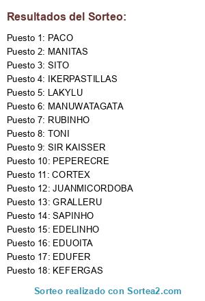 Lista de participantes: MANITAS, SAPINHO, SITO, MANUWATAGATA, IKERPASTILLAS, JUANMICORDOBA, KEFERGAS, PEPERECRE, EDUOITA, PACO, LAKYLU, EDUFER, GRALLERU, RUBINHO, CORTEX, EDELINHO, TONI, SIR KAISSER.
