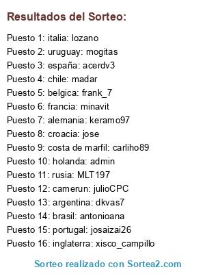 Lista de participantes: argentina: dkvas7, alemania: keramo97, belgica: frank_7, brasil: antonioana, chile: madar, costa de marfil: carliho89, croacia: jose, inglaterra: xisco_campillo, francia: minavit, italia: lozano, holanda: admin, portugal: josaizai26, españa: acerdv3, rusia: MLT197, uruguay: mogitas, camerun: julioCPC.