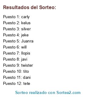 Lista de participantes: tito, twister, jeke, silver, Juanra, kelus, tete, llopis, dani, javi, carly, will.
