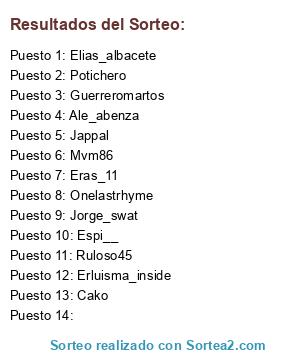 Lista de participantes: Guerreromartos, Elias_albacete, Jorge_swat, Potichero, Espi__, Mvm86, Onelastrhyme, Erluisma_inside, Ale_abenza, Eras_11, Cako, Jappal, Ruloso45, Kurakku, .