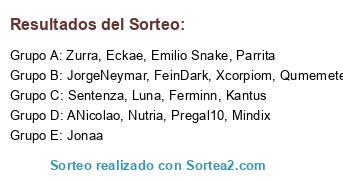 Lista de participantes: ANicolao, Pregal10, Qumemetes, Parrita, Nutria, Kantus, FeinDark, JorgeNeymar, Ferminn, Emilio Snake, Eckae, Luna, Mindix, Jonaa, Xcorpiom, Sentenza, Zurra.