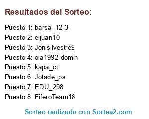 Lista de participantes: barsa_12-3, EDU_298, eljuan10, Jonisilvestre9, Jotade_ps, FiferoTeam18, kapa_ct, ola1992-domin.
