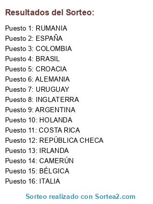 Lista de participantes: ITALIA, URUGUAY, IRLANDA, RUMANIA, BRASIL, ARGENTINA, ESPAÑA, CROACIA, COLOMBIA, CAMERÚN, BÉLGICA, INGLATERRA, HOLANDA, ALEMANIA, COSTA RICA, REPÚBLICA CHECA.