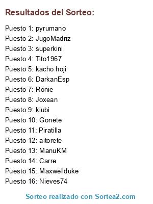 Lista de participantes: Piratilla, DarkanEsp, Carre, Nieves74, Ronie, Tito1967, kacho hoji, Joxean, Maxwellduke, pyrumano, superkini, Gonete, kiubi, ManuKM, aitorete, JugoMadriz.