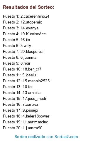 Lista de participantes: 1.juanrra90, 2.cacerenhino24, 3.willy, 4.keler18power, 5.joselu, 6.juanma, 7.xanxez, 8.noir, 9.jossepi, 10.fer, 11.matmarciuc, 12.atopemix, 13.arniella, 14.evanya, 15.manolo2525, 16.ito, 17.jose_medi, 18.ber_cr7, 19.KuroixxAce, 20.blasperez.