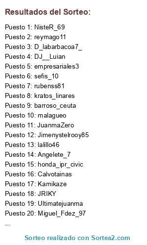 Lista de participantes: JRIKY, kratos_linares, Montixx94, aemepoam, DJ__Luian, Ultimatejuanma, NisteR_69, rubenss81, topotencia, Calvotainas, LUISKAYAZA FALTA, Julio_RD7, lalillo46, D_labarbacoa7_, sefis_10, guanchu, barroso_ceuta, Kamikaze, reymago11, Ceutito, honda_ipr_civic, Jimenystelrooy85, Fabiete-murcia, Miguel_Fdez_97, JuanmaZero, empresariales3, Angelete_7, malagueo.