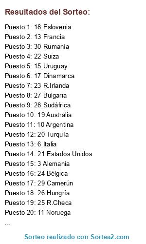 Lista de participantes: 1 España, 2 Holanda, 3 Alemania, 4 Inglaterra, 5 Brasil, 6 Italia, 7 Portugal, 8 Croacia, 9 México, 10 Argentina, 11 Noruega, 12 Grecia, 13 Francia, 14 Rusia, 15 Uruguay, 16 Suecia, 17 Dinamarca, 18 Eslovenia, 19 Australia, 20 Turquía, 21 Estados Unidos, 22 Suiza, 23 R.Irlanda, 24 Bélgica, 25 R.Checa, 26 Hungría, 27 Bulgaria, 28 Sudáfrica, 29 Camerún, 30 Rumanía.