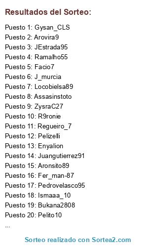 Lista de participantes: Danieliyo, Assasinstoto, IvaanM95, Over1990, JEstrada95, Juangutierrez91, Pabloggv, Isma123i, Ramalho55, Nava_21_, Gysan_CLS, R9ronie, Hosquin7, Furru_asesino21, J_murcia, Pelito10, Locobielsa89, Bukana2808, Pelizelli, Ankibusa, Ergoncho, Regueiro_7, Ismaaa_10, Jemi666, Facio7, Pedrovelasco95, Enyalion, ZysraC27, Aronsito89, Fer_man-87, Abraham_2210, Arovira9.