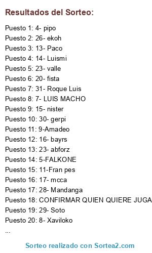 Lista de participantes: CONFIRMAR QUIEN QUIERE JUGAR EL MUNDIAL COPIA Y PEGA, 1-BELLOTO, 2- RYCHY, 3- elvis, 4- pipo, 5-FALKONE, 6- FERRARI, 7- LUIS MACHO, 8- Xaviloko, 9-Amadeo, 10-Fabiano, 11-Fran pes, 12- abaito, 13- Paco, 14- Luismi, 15- nister, 16- bayrs, 17- mcca, 18- vazquezbook, 19- cheche, 20- fista, 21- franchip, 22- adumat, 23- abforz, 23- valle, 25- intocable, 26- ekoh, 27 -Javi jpf, 28- Mandanga, 29- Soto, 30- gerpi, 31- Roque Luis, 32- pacoeste.