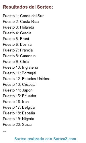 Lista de participantes: Brasil, Croacia, Mexico, Camerun, España, Holanda, Chile, Australia, Colombia, Grecia, Costa de Marfil, Japon, Uruguay, Costa Rica, Inglaterra, Italia, Suiza, Ecuador, Francia, Honduras, Argentina, Bosnia, Iran, Nigeria, Alemania, Portugal, Ghana, Estados Unidos, Belgica, Argelia, Rusia, Corea del Sur.