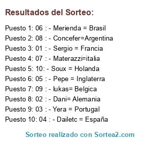 Lista de participantes: 01 : - Sergio = Francia, 02 : - Dani= Alemania, 03 : - Yera = Portugal, 04 : - Dailetc = España, 05 : - Pepe = Inglaterra, 06 : - Merienda = Brasil, 07 : - Materazzi=italia, 08 : - Concefer=Argentina, 09 : - lukas= Belgica, 10: - Soux = Holanda.