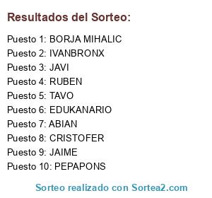 Lista de participantes: RUBEN, CRISTOFER, JAVI, ABIAN, PEPAPONS, EDUKANARIO, IVANBRONX, TAVO, BORJA MIHALIC, JAIME.