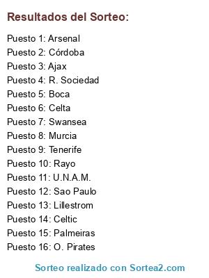 Lista de participantes: Las Palmas, Borussia Dortmund, Inter de Milan, Celta de Vigo, Athletic Club, Leicester, Sevilla, Bayern de Munich, Manchester United, Ajax, Boca Juniors, Real Zaragoza, Milan, Udinese, Barcelona, Atlético de Madrid.