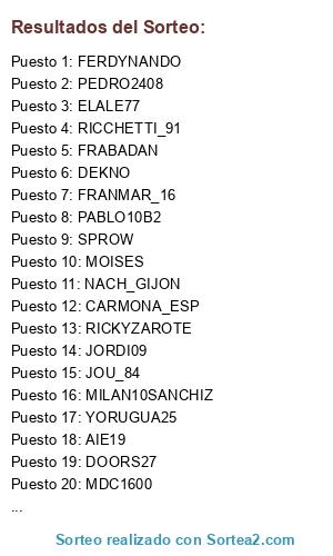 Lista de participantes: OKZRPANDA, FRANMAR_16, MDC1600, HERIVEGA, JOU_84, RICCHETTI_91, JORDI09, AIE19, SPROW, FRABADAN, MOISES, CARMONA_ESP, PABLO10B2, X_ZLATAN_X, RIKI_32, ELALE77, DOORS27, PEDRO2408, DEKNO, FERDYNANDO, CAPITAN_VENENO, NACH_GIJON, MILAN10SANCHIZ, RICKYZAROTE, YORUGUA25.